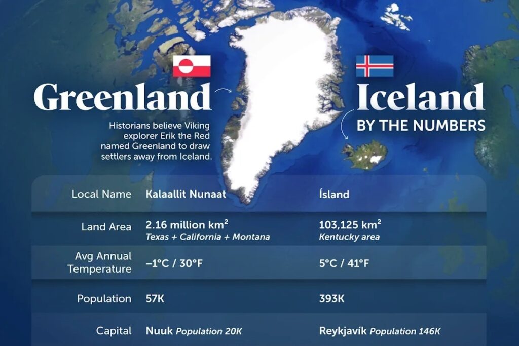 ایسلند و گرینلند بهدلیل شباهت اسمی اغلب با یکدیگر اشتباه گرفته میشوند، اما از نظر جغرافیا، اقلیم، جمعیت و وضعیت سیاسی تفاوتهای چشمگیری دارند. گرینلند از نظر مساحت خشکی بیش از ۲۰ برابر بزرگتر از ایسلند است، اما جمعیتی حدود یکهفتم آن دارد. ایسلند...
